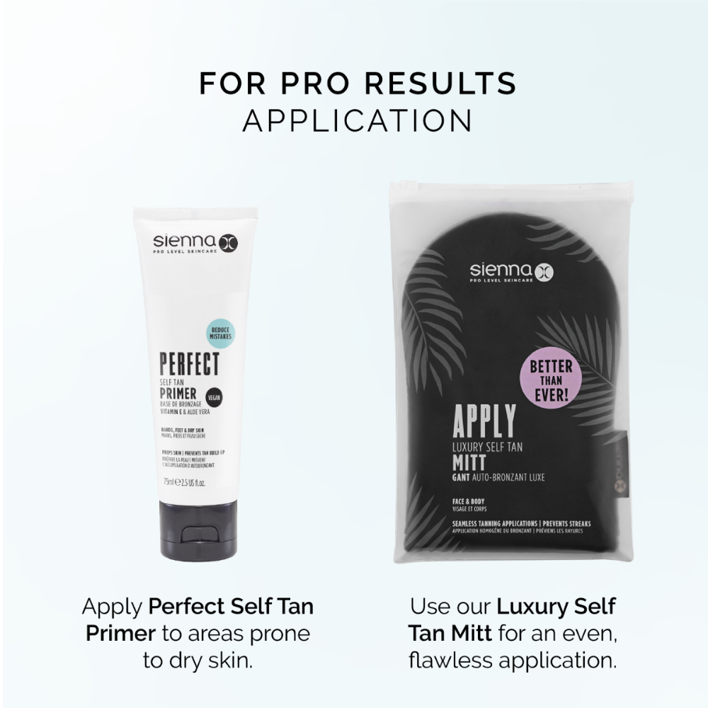 - Apply Sienna X Perfect Tan Primer to elbows, hands, knees, ankles and feet for a professional finish.