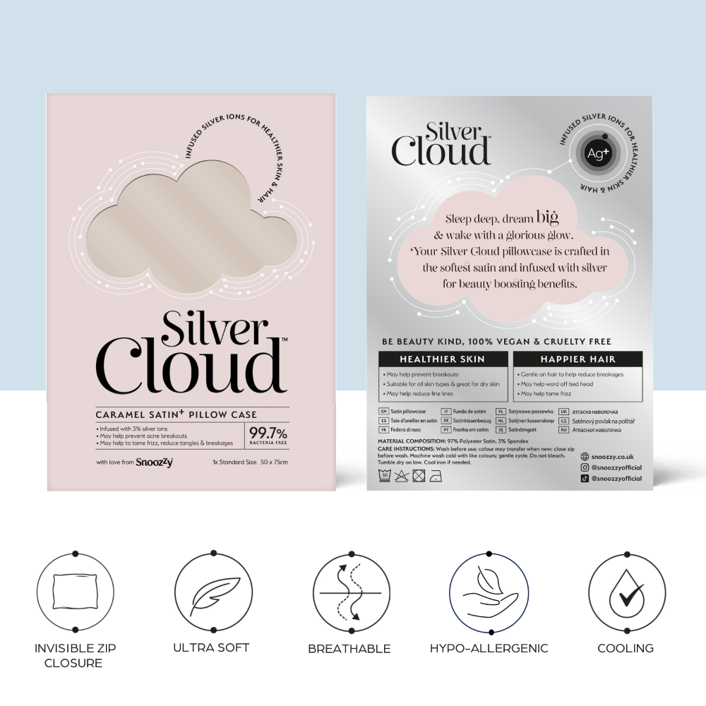 Silver Cloud Satin Pillowcase Caramel is your key to deep, restorative sleep and a radiant morning glow. This luxurious pillowcase is woven from the softest satin, enriched with natural Silver Ions to enhance your beauty sleep.