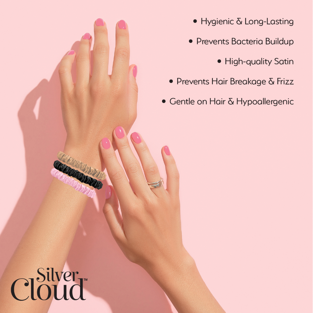 Infused with advanced Silver Ion technology and crafted from premium satin, these scrunchies not only accessorise your look but also promote healthier hair by inhibiting bacterial growth. The luxurious satin material minimises hair breakage and frizz, ensuring your locks remain smooth and well-maintained. Cruelty-free & vegan-friendly.