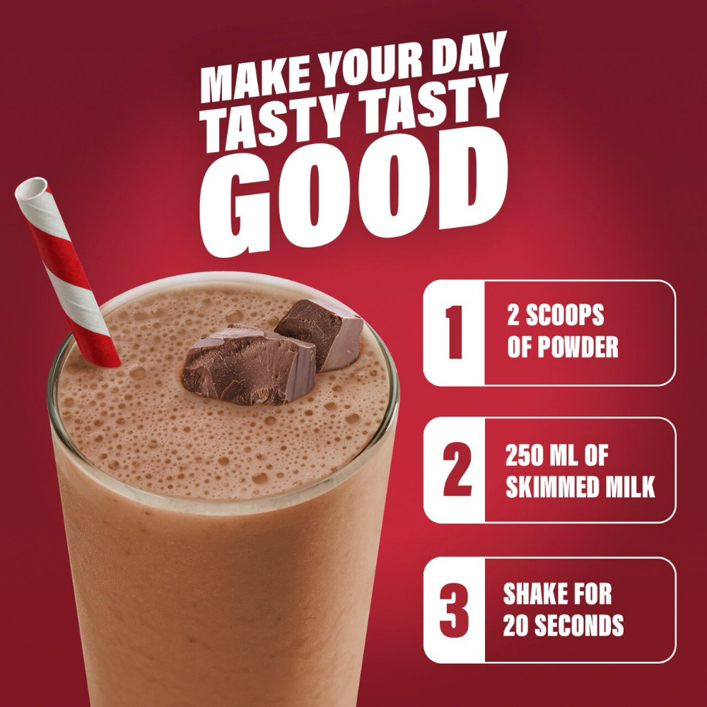 - Mix 2 level scoops of powder with 250ml of cold skimmed milk and stir well to create a meal replacement shake.
