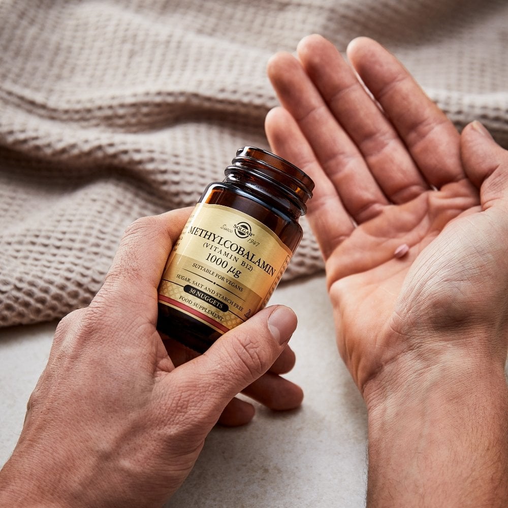 Vitamin B12 fulfils a number of different roles in the body including the reduction of tiredness, helping the release of energy from foods, and supporting general vitality and wellbeing. It supports the health of the nervous system, cell division, healthy blood cell formation and normal psychological function. Vitamin B12 is found naturally in fish, dairy produce, organ meats, beef, pork, and fortified foods and is a water-soluble vitamin. Solgar's Methylcobalamin Nuggets effectively bypass the stomach so the Vitamin B12 dosage is absorbed directly into the blood.