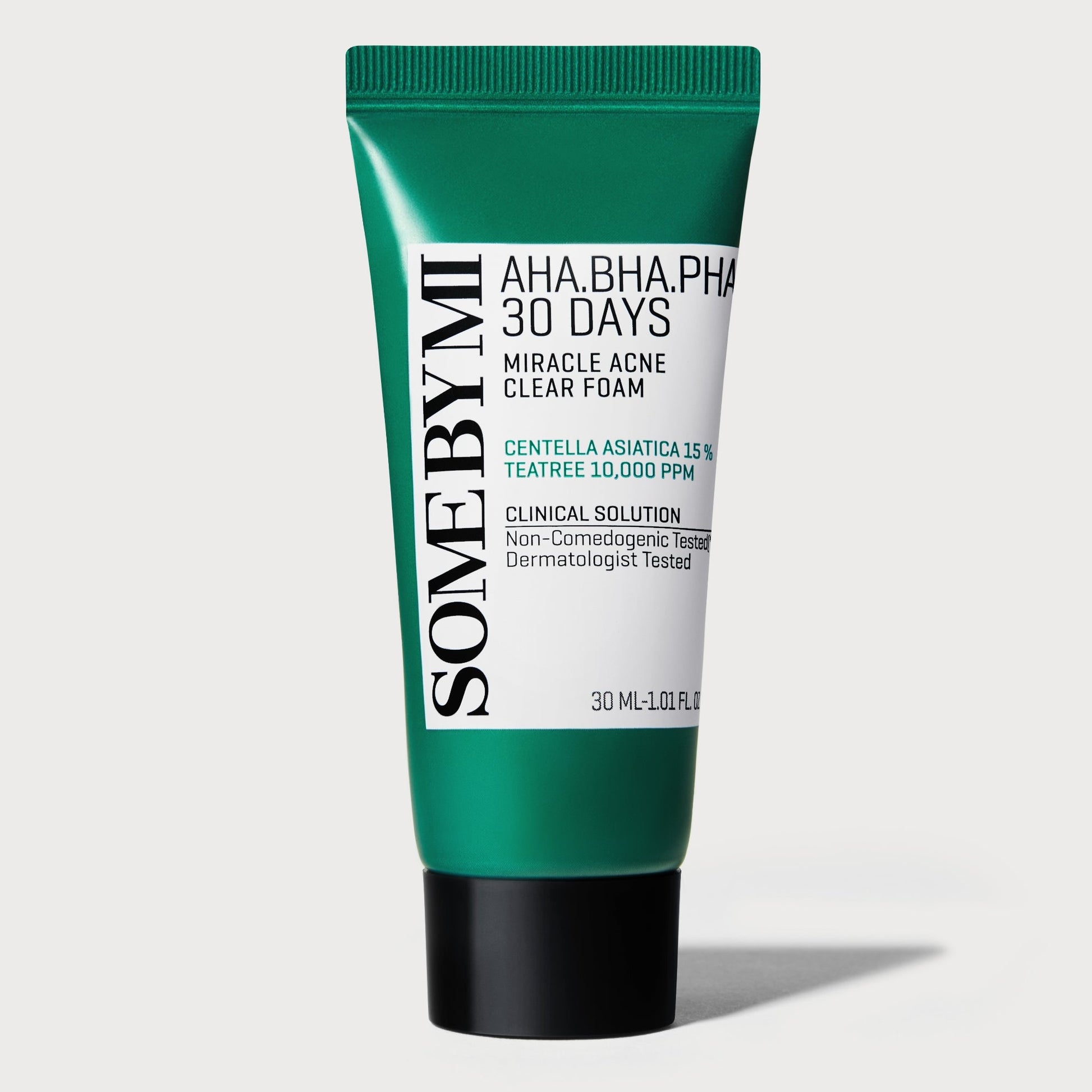 - 1 x Some By Mi 30 days AHA, BHA, PHA Miracle Cleansing Foam (30ml) - tailored for those dealing with acne, irritation, and concerns over oil control and pores. Ideal for combination, dry, normal, oily, and sensitive skin types, this cleanser is designed to refine skin texture and manage oil production effectively. With a potent blend of AHA, BHA, and PHA, it works to slough off dead skin cells and unclog pores, while Truecica provides a calming effect during the cleansing process. This formula is tough on blemishes but gentle on the skin, making it an excellent choice for congested skin types. The inclusion of Tea Tree oil targets acne, while AHA exfoliates the skin's surface, BHA deep cleanses pores, and PHA prevents moisture loss, ensuring the skin remains hydrated and smooth. For those aiming to combat acne breakouts, this cleanser, enriched with soothing Calamine and Centella Asiatica, offers a gentle yet effective solution, nourishing even the most sensitive skin.
