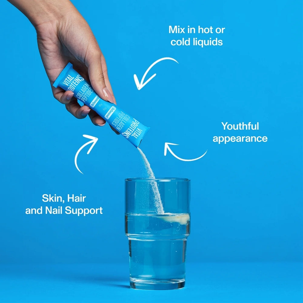Vital Proteins Unflavoured Collagen Peptides Sachets (10 x 10g) is an unflavoured powder which can be added to hot or cold liquids, such as water, tea, coffee, or smoothies, to support healthy bones and joints, whilst promoting a youthful appearance with healthier-looking skin, hair, and nails.