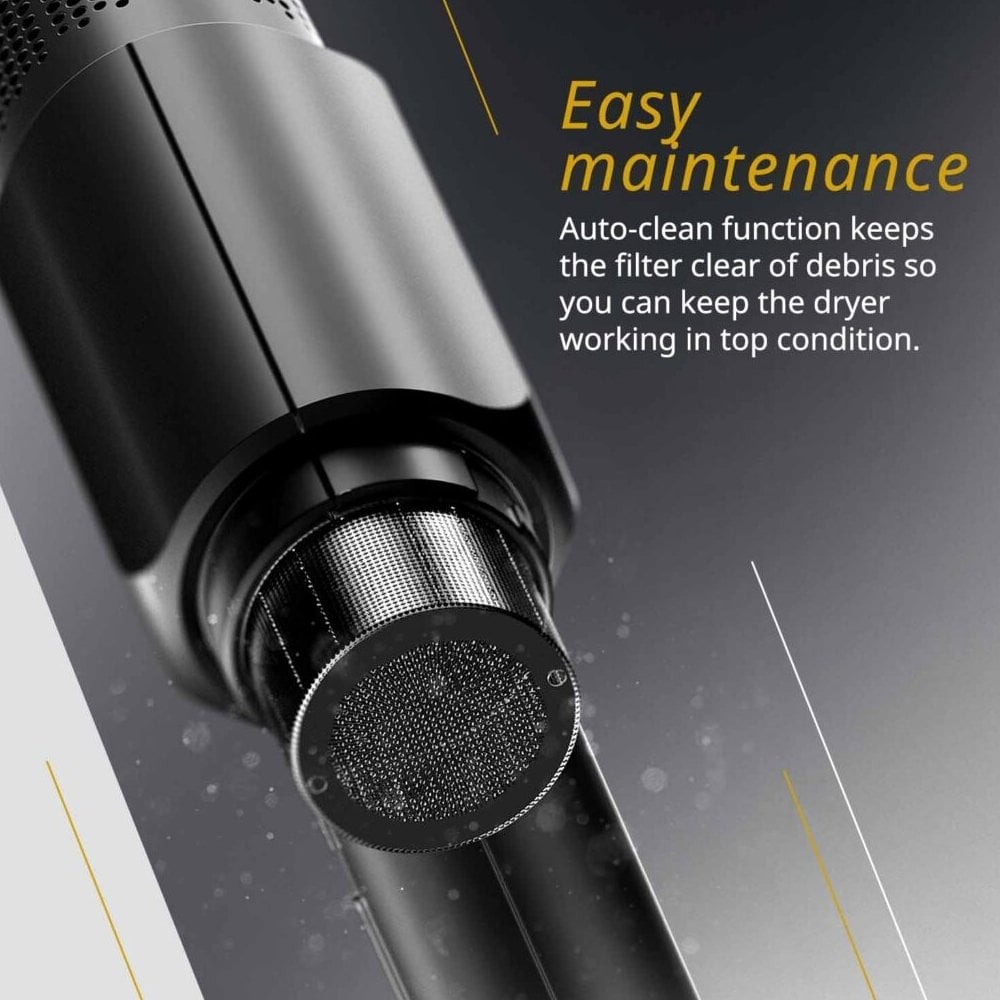The dryer includes an LED screen that displays current heat and speed settings, ensuring full user control. This screen also features a memory function to recall your last settings for convenience. Its motor utilizes Flowcontrol technology for even drying and includes a cool shot option to boost styling versatility. Furthermore, the Vanquish Hair Dryer is equipped with an Auto-clean function for effortless maintenance.