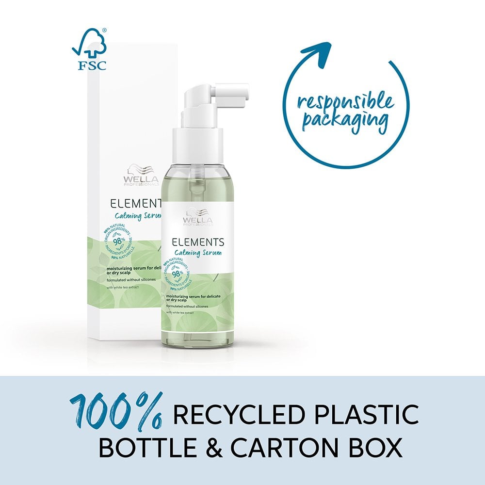 Wella Professionals Elements Calming Serum (100ml) is a moisturising serum formulated with 98% ingredients of natural origin. It helps restore scalp comfort, without impacting hair volume.