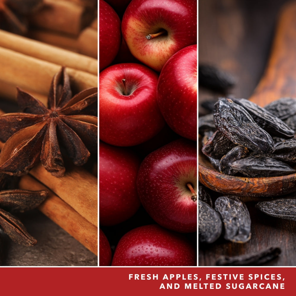 The initial scent, blending Candy Apple, Pear and Caramel, gives way to the main body fragrance of Festive Spices, Cinnamon and Almond. This culminates in a lingering impression of Melted Sugarcane, Musky and Vanilla Bean.