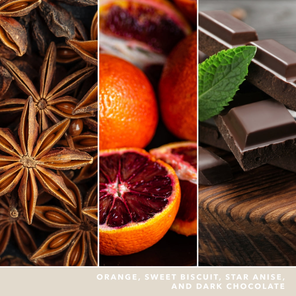 The initial scent, blending Juicy Orange, Citrus Zest Nutmeg, gives way to the main body fragrance of Star Anise, Crushed Cinnamon and Pomander. This culminates in a lingering impression of Dark Chocolate, Graham Crackers and Biscuits.